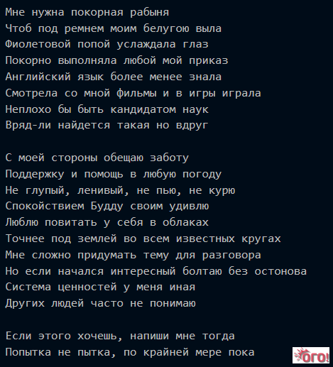 Мне нужна покорная рабыня Чтоб под ремнем моим белугою выла, Стишок целиком сюда не влез Заменит его картинка хайрез